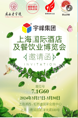 宇峰集團(tuán)上海國(guó)際酒店及餐飲業(yè)博覽會(huì),展位:7.1G60,參展時(shí)間2024年3月27日—3月30日,上海國(guó)際會(huì)展中心我們等您哦!